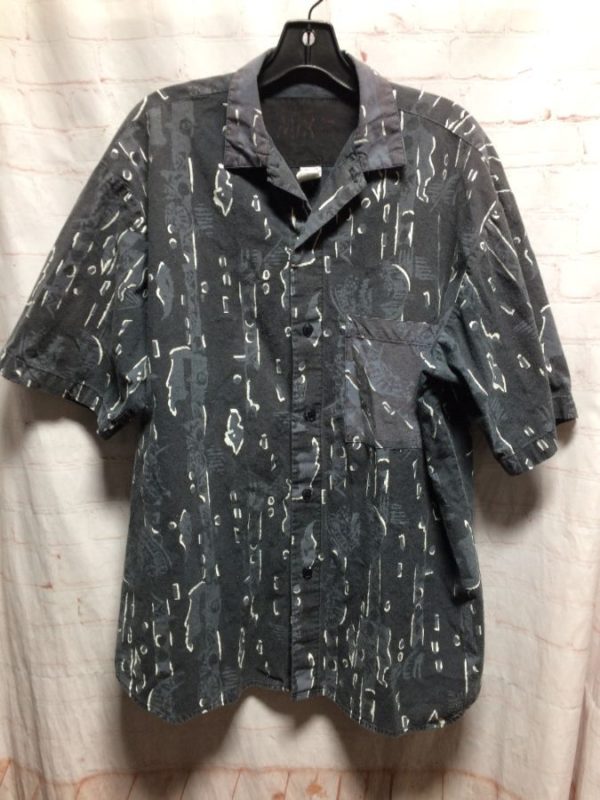 Shirt, 100% cotton, short sleeves, button-up, dark colored tribal design print, single front pocket, black/gray/white, size L