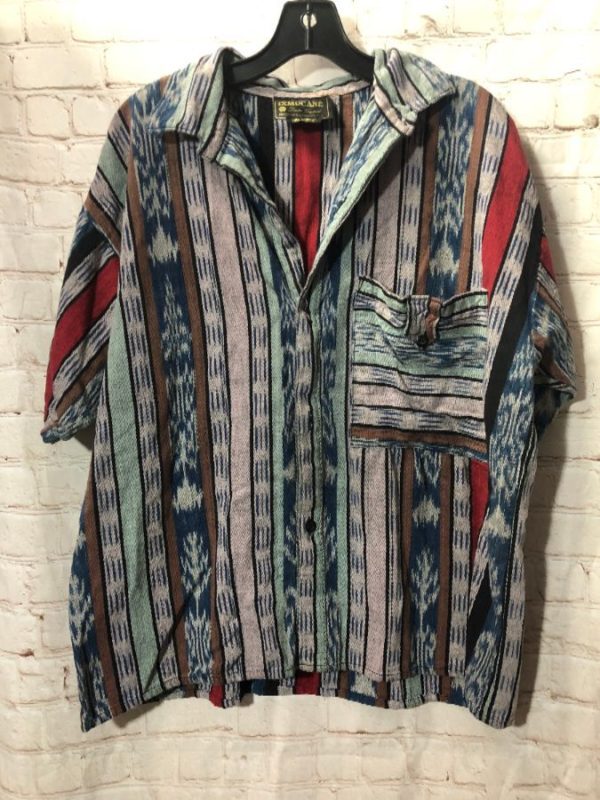 Ixmucane top, cotton, short sleeves, button-up, Ethnic design Ikat woven fabric, front pocket, made in Guatemala, red/black/brown/multi, size L