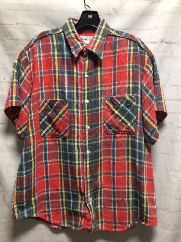 Big Mac flannel shirt, cotton, short sleeves, button-up, classic plaid print, red/yellow/blue/white, size L As is