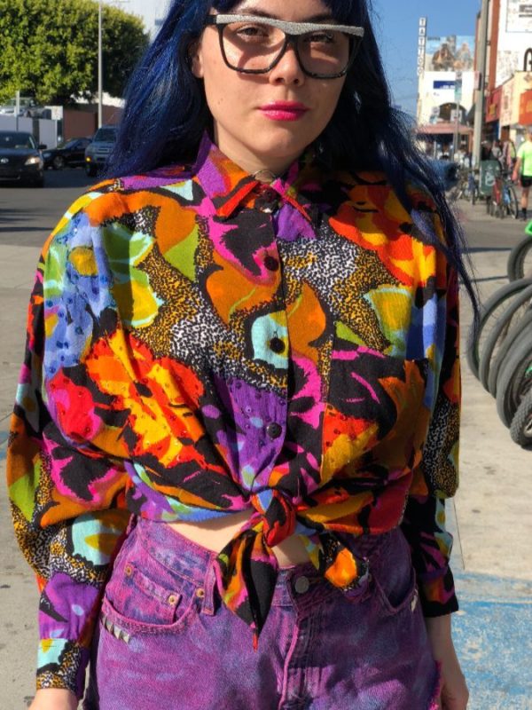 Shirt, long sleeve, button-up, 1 front pocket, floral abstract bedazzled pattern, bold colors, multi, size S