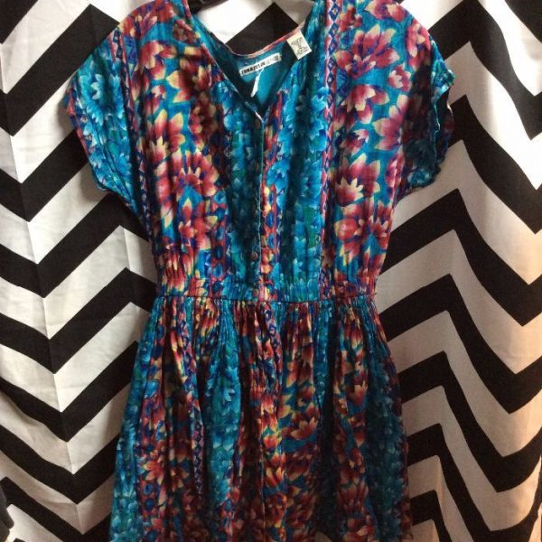 1990’s dress, India cotton, short sleeves, button-up, floral print fabric, blue/pink, size M