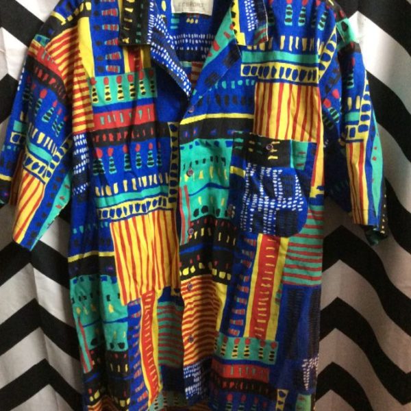 1990’s shirt, short sleeves, button-up, funky decorated squares of color design, blue/green/red/yellow