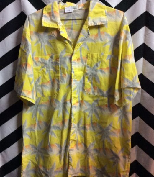 Hawaiian print shirt, short sleeves, button-up, bright color print fabric, yellow/white