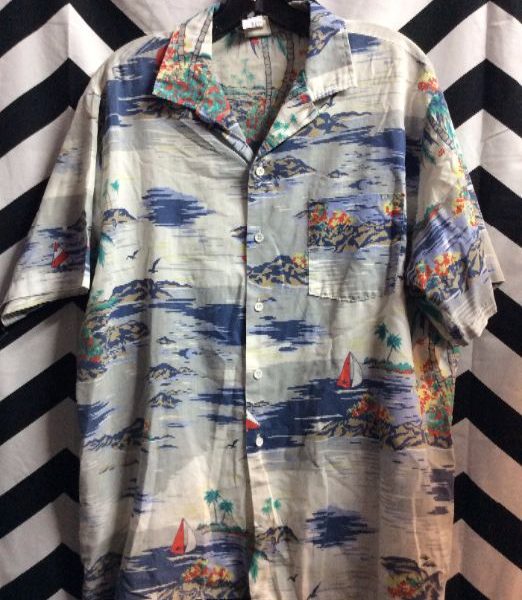 HAWAIIAN PRINT SHIRT SAILBOATS & MELLOW WATER