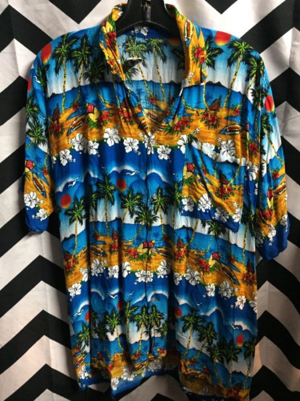 HAWAIIAN SHIRT RAYON SURFBOARD PALM PRINT