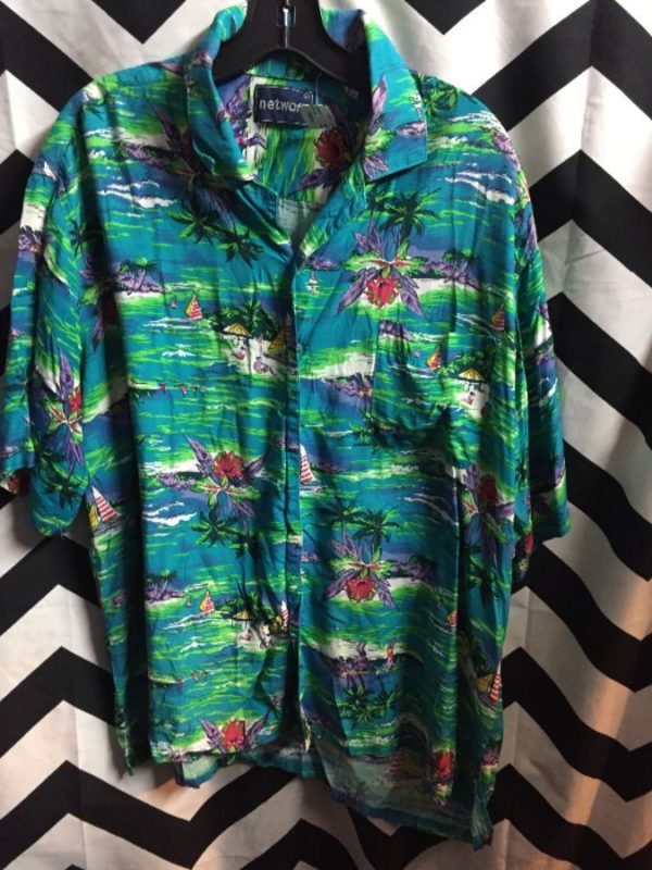HAWAIIAN SHIRT RAYON W/ WAVES SAILBOATS & ORCHID PRINT