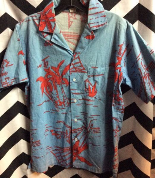 HAWAIIAN SHIRT – COTTON – SAILBOAT & PALM TREE DESIGN