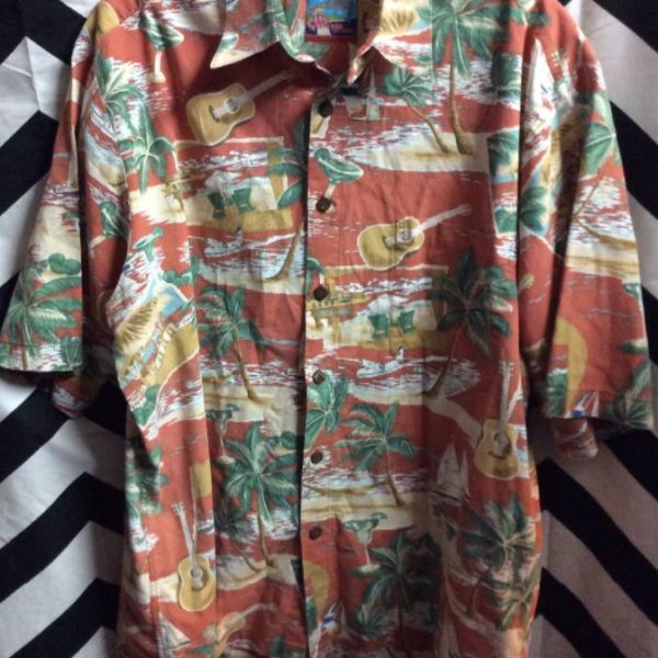 REYN SPOONER HAWAIIAN SHIRT – COTTON – GUITAR/PALM TREE PRINT