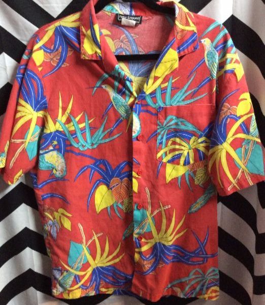 Hawaiian shirt, short sleeve, button-up, floral & bird design print, red/yellow/blue/teal, size L