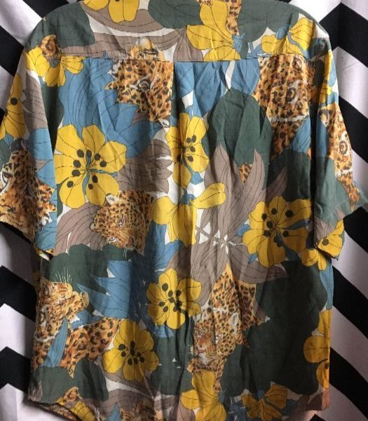Hawaiian shirt, short sleeve, button-up, leopard & tropical flower print, yellow/teal/olive green, size M