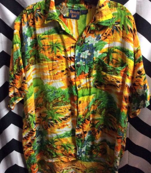 Hawaiian shirt, rayon, short sleeve, button-up, palm tree design, yellow/orange/green, size L
