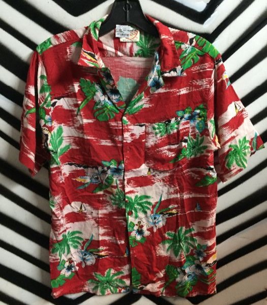Hawaiian Shirt, rayon, red/green/blue palm and floral design, size M – small fit