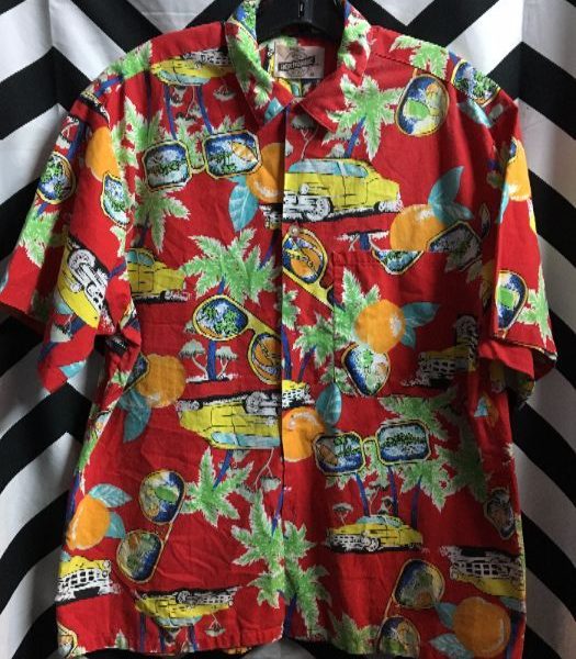 Hawaiian shirt, short sleeve, button-up, orange/sunglass/car print design, red/green/orange/blue/yellow, size M