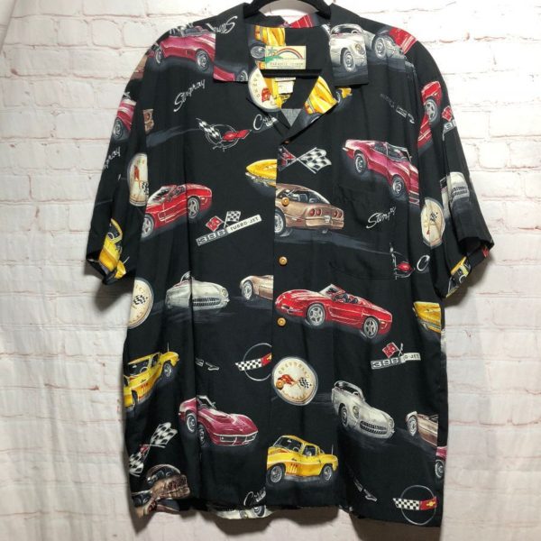 RAYON HAWAIIAN SHIRT W/ GM CORVETTE STINGRAY CAR PRINT FABRIC