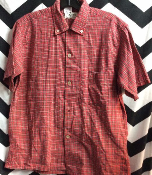 Men’s shirt, short sleeve, button-up, small plaid design, green/red, size M
