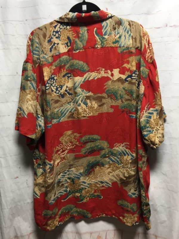 Iolani Hawaiian shirt, short sleeves, button-up, Oriental Dragon design, red/tan/off white/olive green/blue/brown, size L