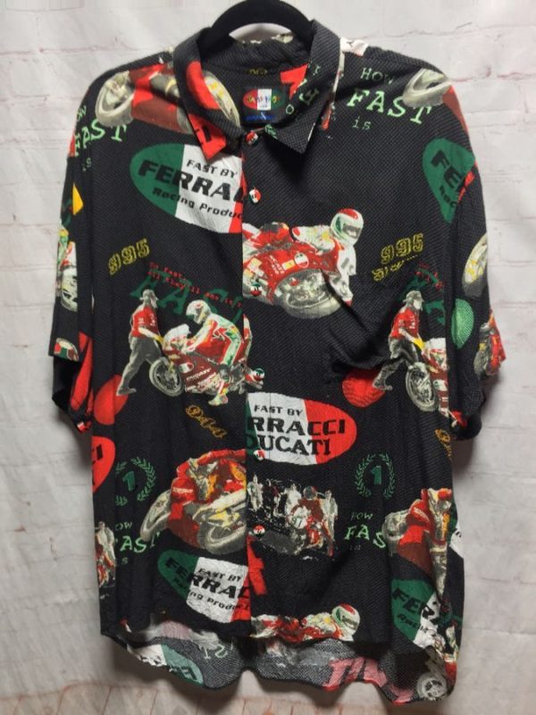 Jam’s World shirt, rayon, short sleeves, button-up, Ferracci Ducati Racing, motorcycle racing all over print, black/red/green/white/yellow, size XL oversized