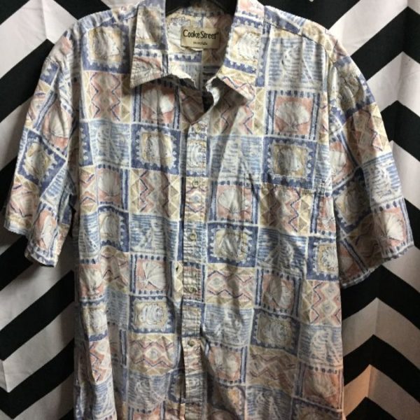 HAWAIIAN SHIRT, AQUATIC IMAGE SQUARES, PASTEL COLORS