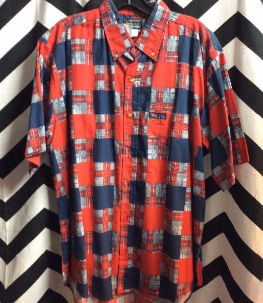 Shirt, short sleeve, button-up, checkered patchwork design, red/blue, size L