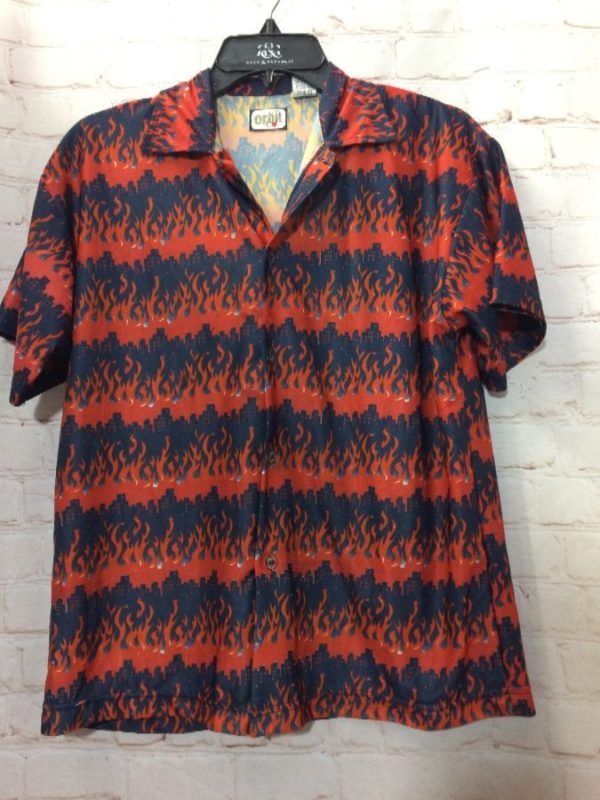 1990’S POLYESTER W/ BUILDING SILHOUETTES & FLAMES HORIZONTAL STRIPE SHIRT