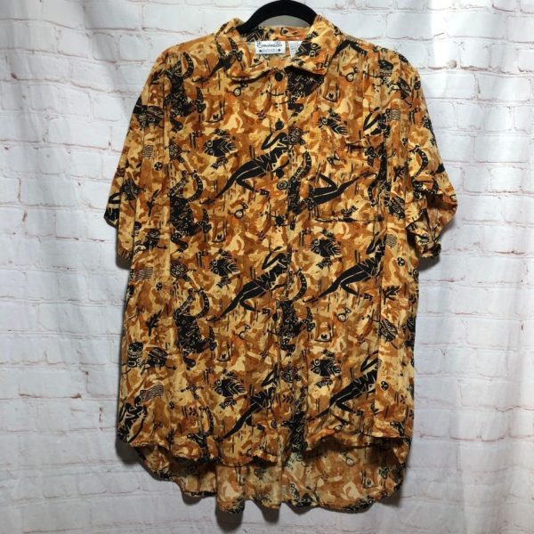 Emeralda Fashions blouse, rayon, short sleeves, button-up, Tribal African print, tan/black, size L