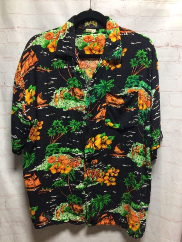 Super Way Hawaiian shirt, rayon, short sleeves, button-up, relaxed vacation vibe with islands/sailboats/palms & floral design print, black/white/green/orange/yellow, size L