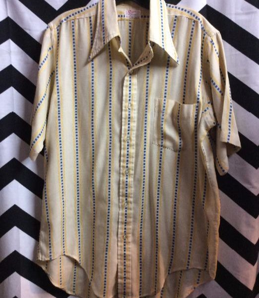 1960’s-1970’s retro vintage shirt, short sleeves, button-up, small squares in a vertical stripe design, yellow/blue, size L