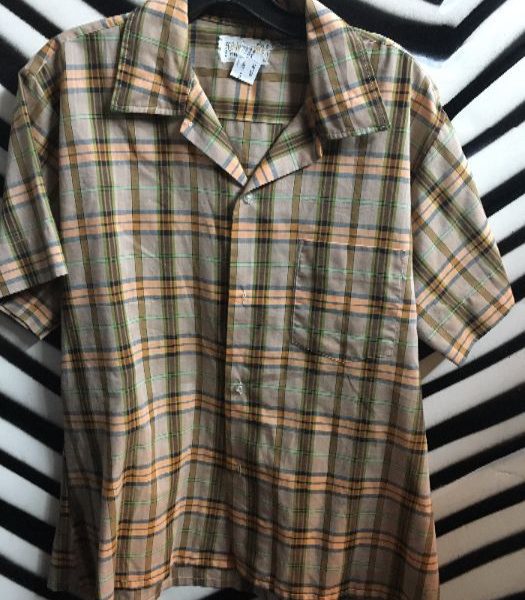Retro shirt, short sleeve button-up, plaid design, tan/peach, size L