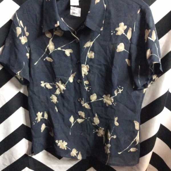 Top, short sleeves, button-up, sheer, floral design print, black/tan