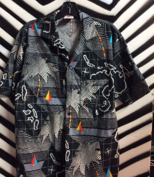 HAWAIIAN SHIRT W/MAP COMPASS MULTI-COLORED PRINT DESIGN