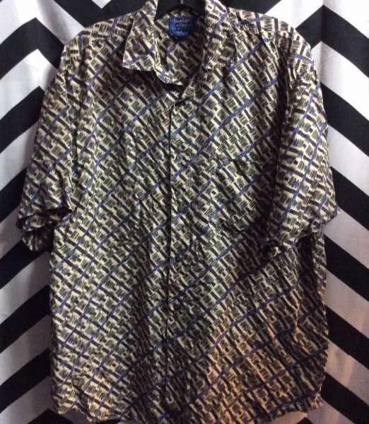 Shirt, short sleeves, button-up, silk, geometric pattern, white/olive green/purple, size M