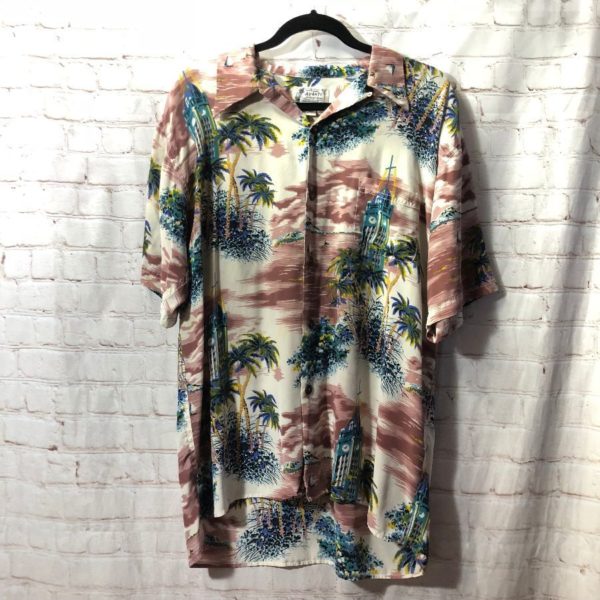 SS BD SILK HAWAIIAN SHIRT CITY SCAPE PRINT natural coconut buttons
