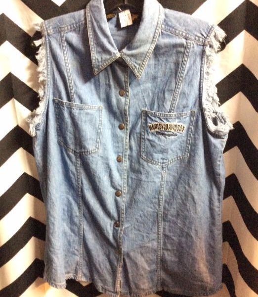 HARLEY DAVIDISON DENIM SHIRT – SLEEVELESS – EMBROIDERED CHEST & BACK DESIGN – FRAYED