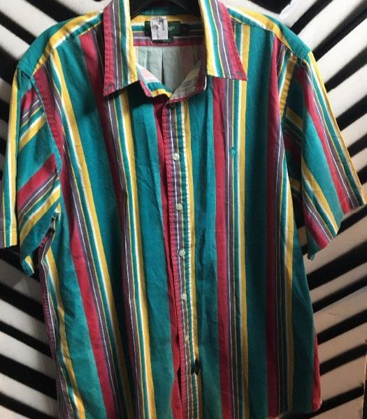 1990’s shirt, short sleeves, striped design, teal/red/yellow