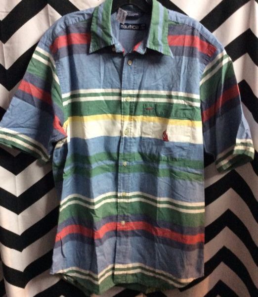 Nautica shirt, short sleeve, button-up, horizontal striped design, blue/multi, size M