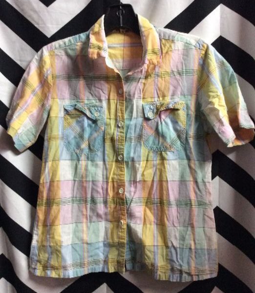 Shirt, short sleeves, button-up, plaid design, pastel colors, orange/blue/green, size M small fit