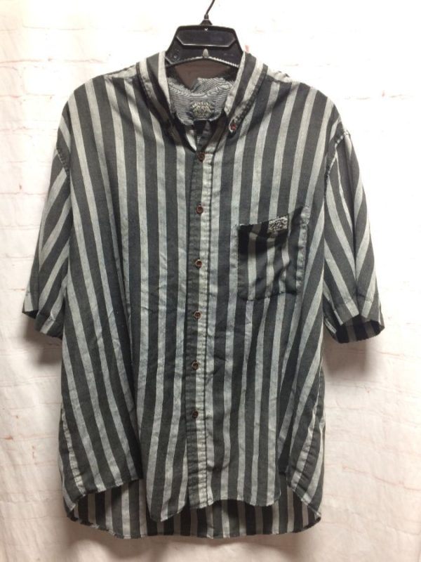 Brittania shirt, short sleeves, button-up, thin, vertical stripes, single front pocket, black/gray, size XL As is