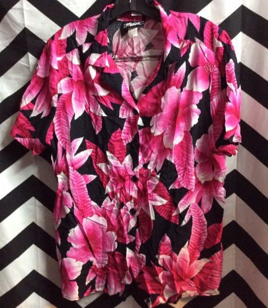 Hawaiian shirt, short sleeve, button-up, rayon, multi tone floral print, light pink/dark pink/black, size 42