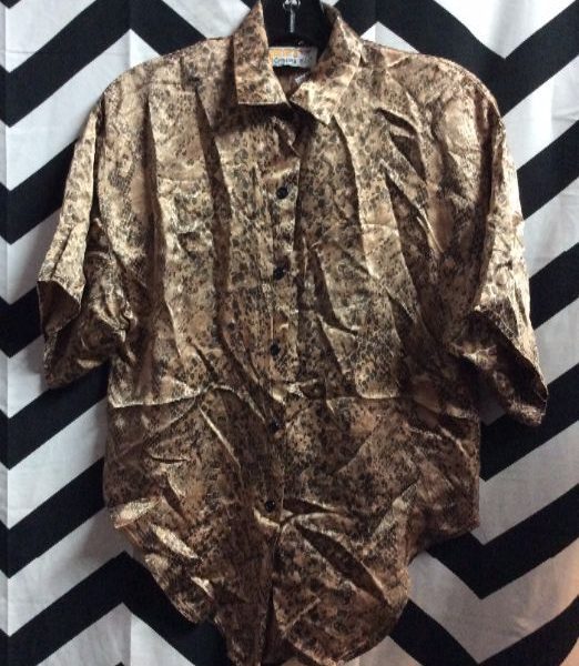 Top, satin, short sleeves, button-up, snake print design, tie front, tan/brown/black