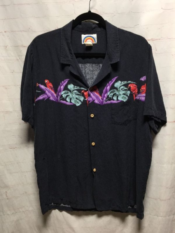 Paradise Found shirt, rayon, short sleeves, button-up, band of Tropical floral and Parrot print around shirt at chest height, black/red/purple/green, size L