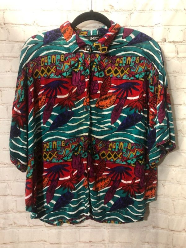 Top, rayon, cropped, short sleeves, button-up, tropical print with palms/leaves/ocean waves in vertical pattern, pink/teal/purple/black/red, size M