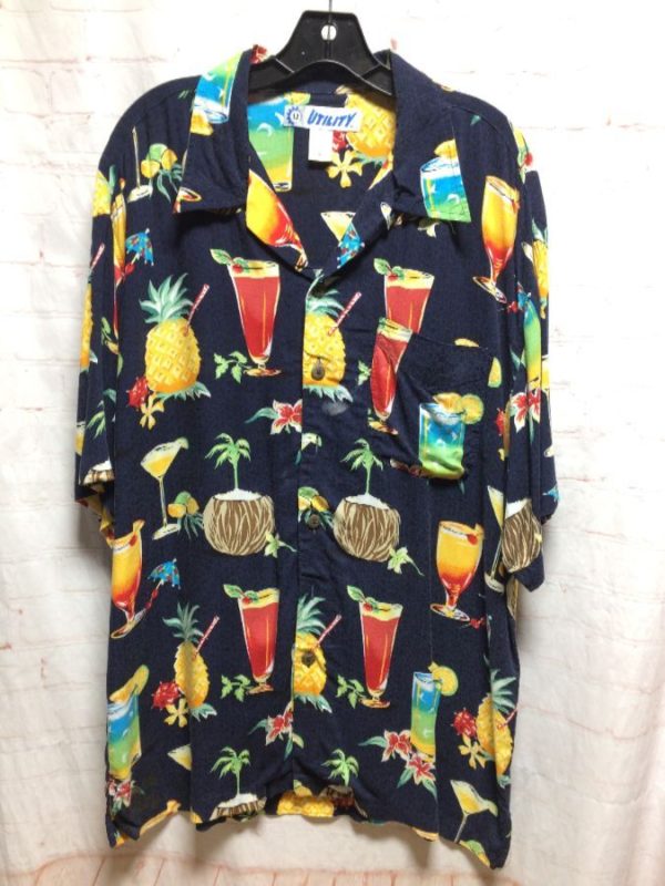 Utility Hawaiian shirt, rayon, short sleeves, button-up, tropical drinks/cocktails & flowers, navy-blue/red/green/blue, size L