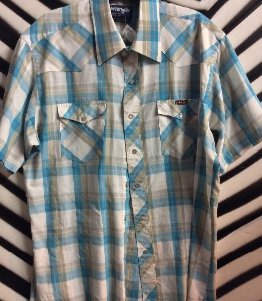 Wrangler Western shirt, short sleeve button-up, snap buttons, plaid design, turq/white/grey