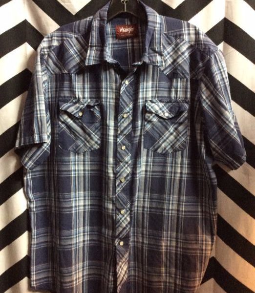 Wrangler Western shirt, short sleeves, button-up with pearl snaps, plaid design, blue/white, size XL