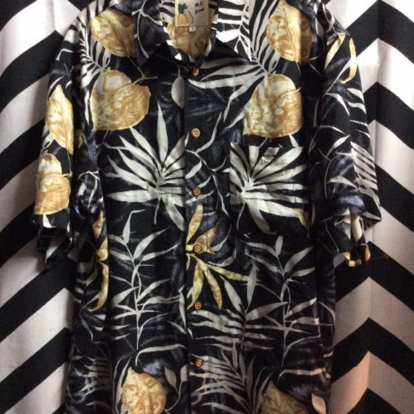 Hawaiian shirt, short sleeves, button-up, leaf design print, black/yellow/white, size L