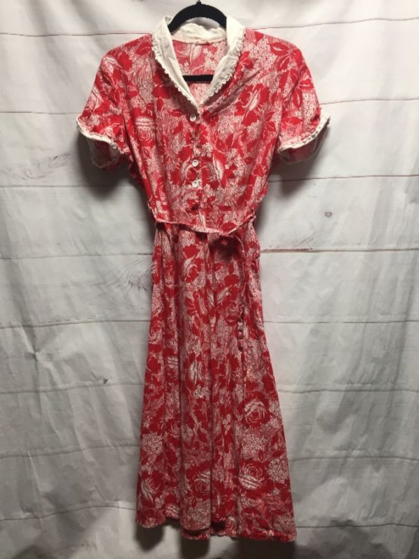 SS BELTED DRESS ROSE FLOWER PRINT LACE TRIM SOLID COLLAR – AS IS