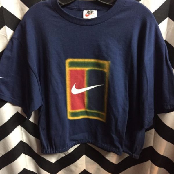 Nike T-shirt, cropped, short sleeve, white tag, boxy cut, navy/red/orange/green/white