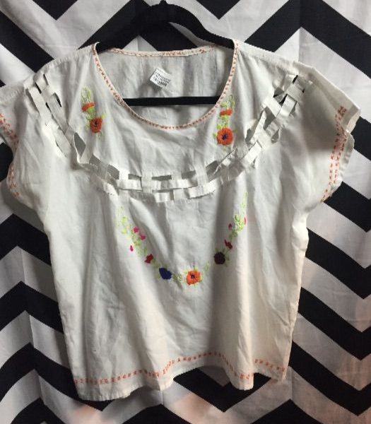 PULLOVER SHIRT W/FLORAL EMBROIDERY – CUT OUT DESIGN W/WOVEN RIBBON