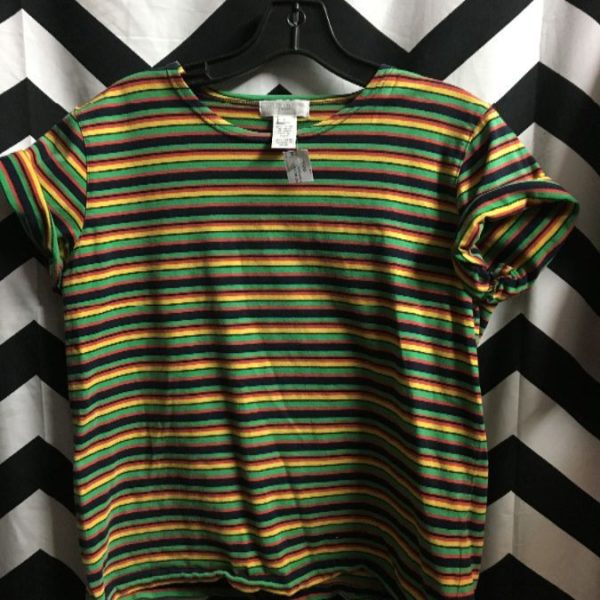 Jones of New York pullover top, short sleeves, boxy style, stretchy fabric, horizontal striped pattern, black/green/red/yellow, size L