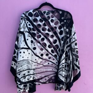 SHEER SILK BUTTERFLY PRINT SHORT KIMONO STYLE SHAWL W/ BEADED TRIM
